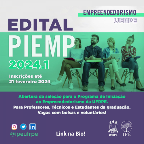Estão prorrogadas as submissões de propostas para o Programa de Incentivo ao Empreendedorismo - PIEMP 2024.1 até o dia 01 de março de 2024.